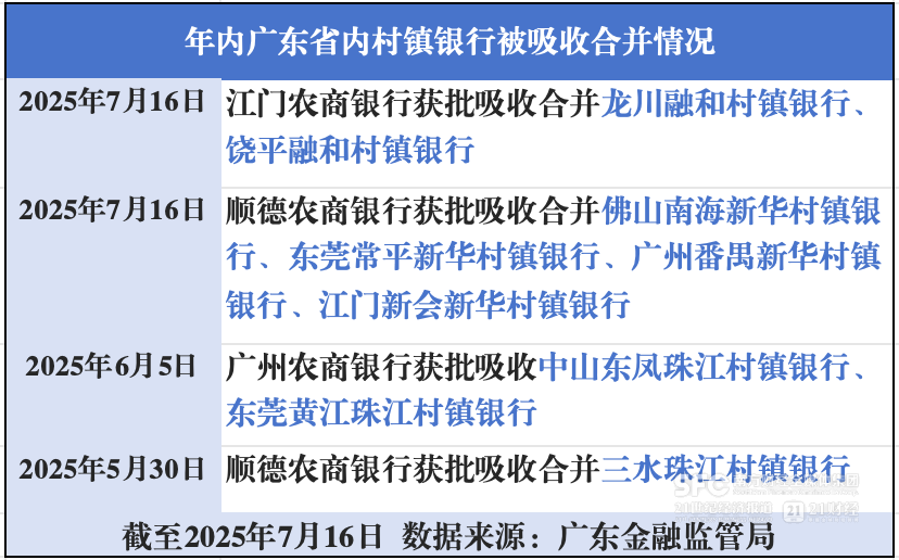 更早前的6月,广东金融监管局还批复同意了广州农商银行吸收合并中山东凤珠江村镇银行、东莞黄江珠江村镇银行。